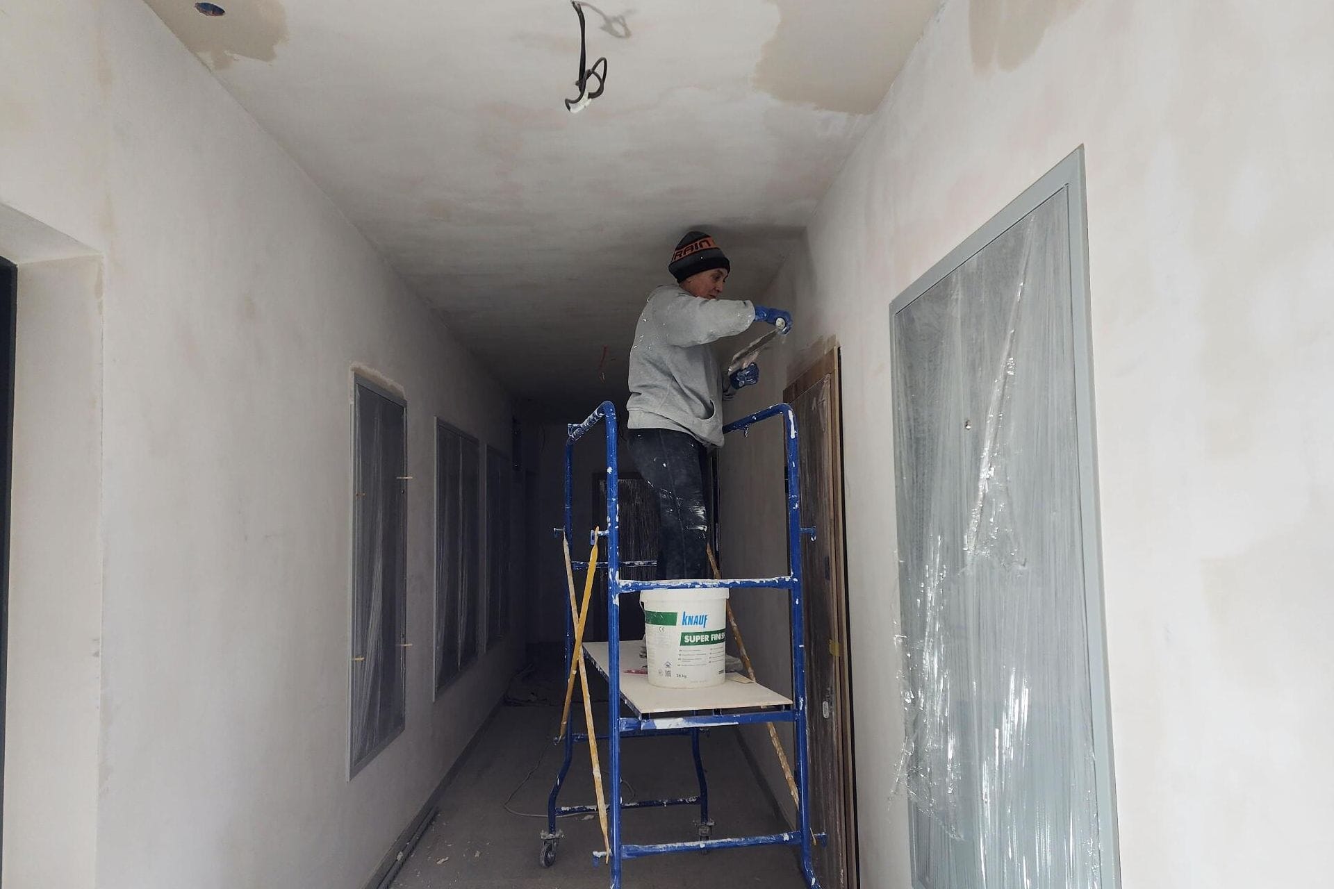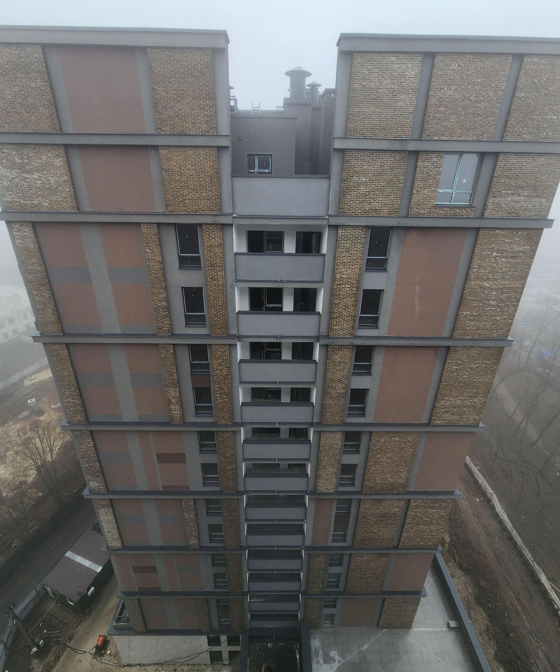 Monolithic works fully completed, roofing installed, masonry work on external, inter-apartment, and interior walls finished.